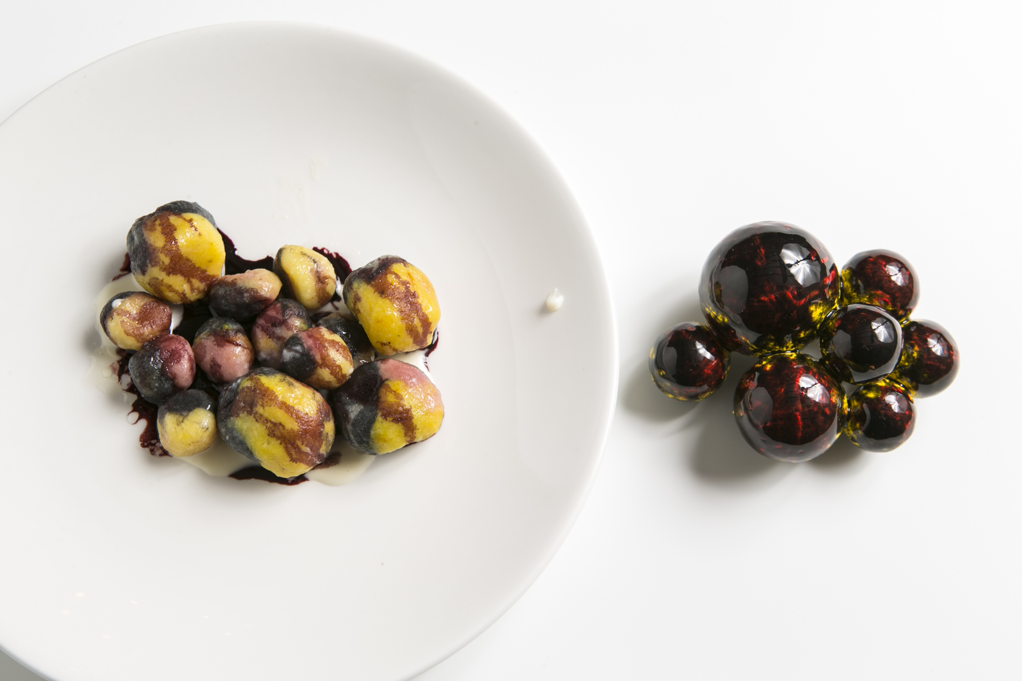 (Gnocchi di raparossa, riso nero e zafferano al parmigiano reggiano 90 mesi con La Jara Chardonnay Colli Piacentini Doc, 1999)