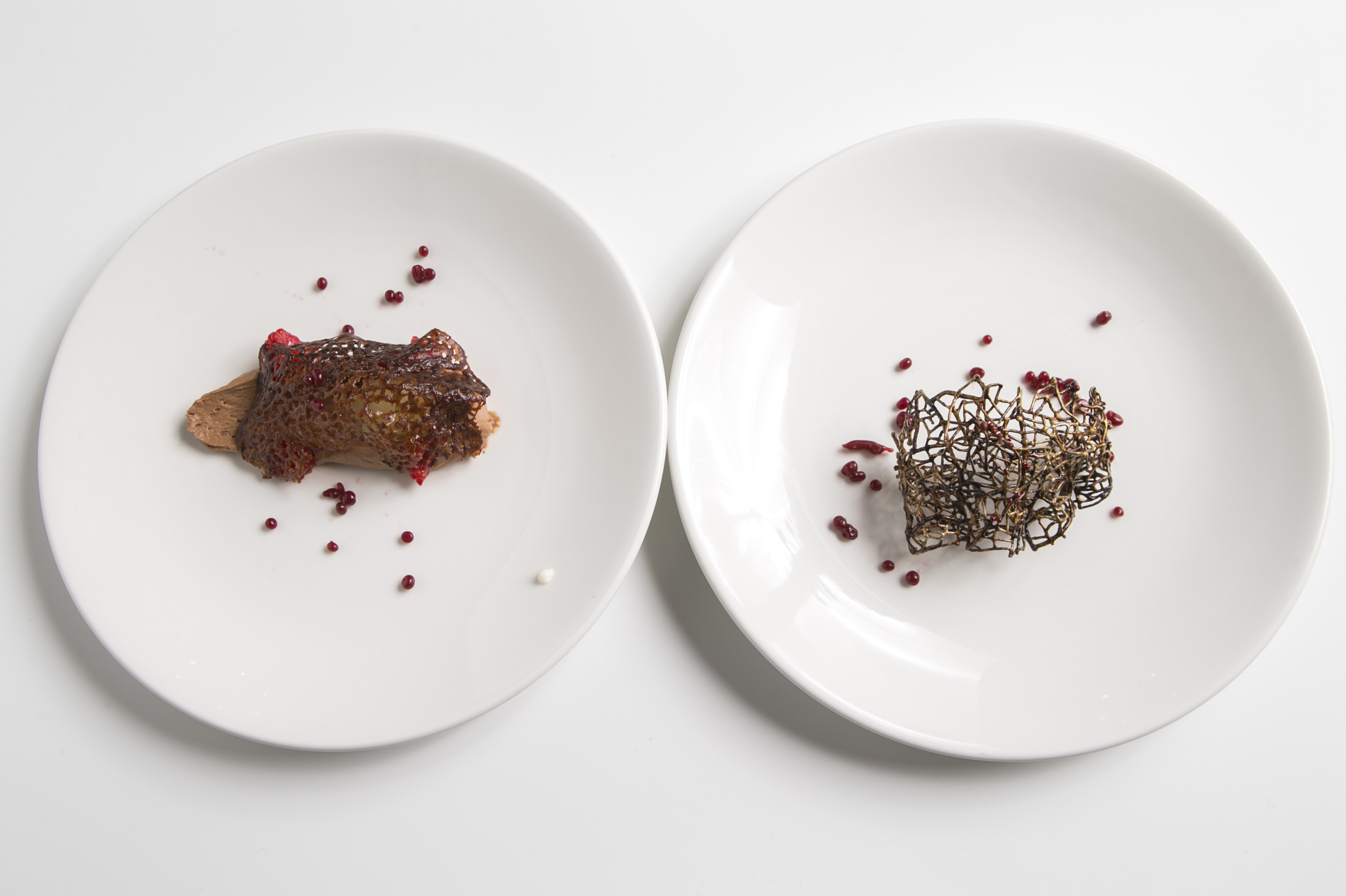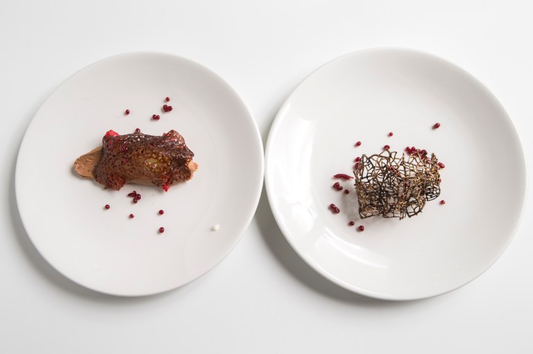 (Cioccolato, caviale di lamponi, sorbetto di rabarbaro e melissa con Ottavo Giorno vino da uve stramature, 2013)