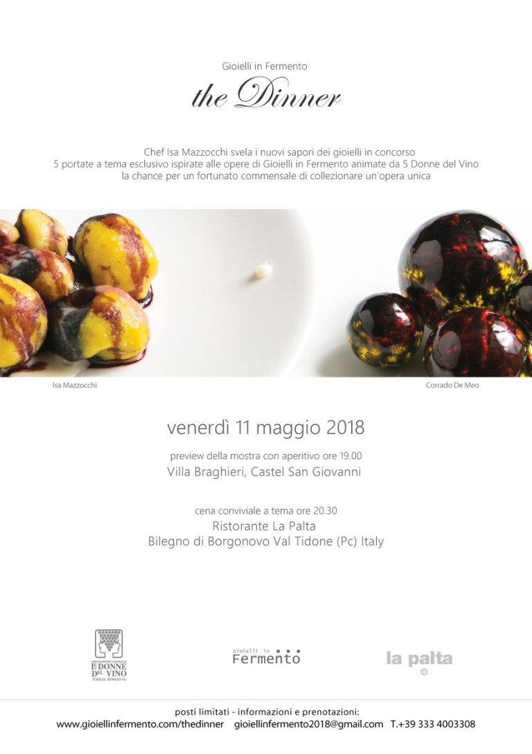 Ci troveremo per l’aperitivo con visita in anteprima della mostra nelle sale allestite di Villa Braghieri e proseguiremo la serata al Ristorante La Palta dove Isa Mazzocchi con Monica e Roberto ci accoglieranno in sala nell’atmosfera preziosa della cena conviviale di Gioielli in Fermento 2018
