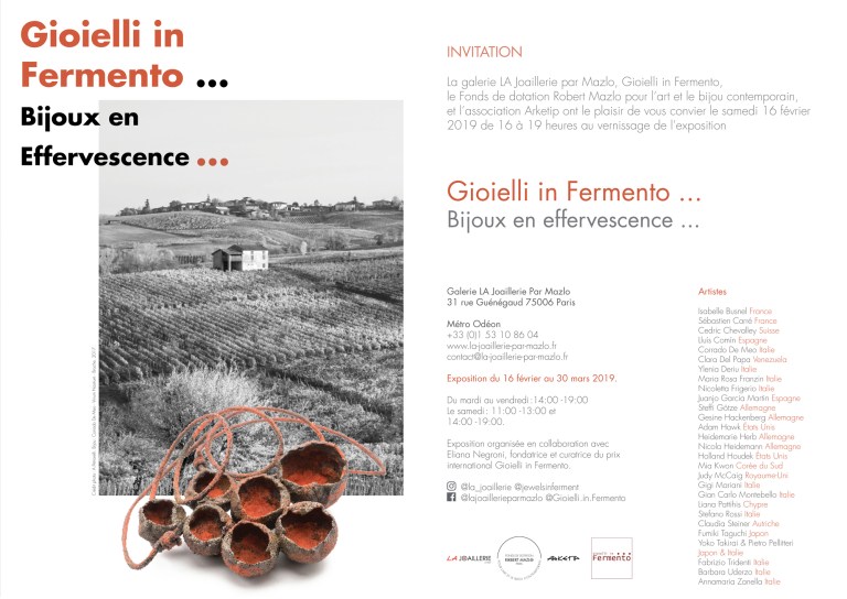 Per l’apertura della stagione 2019, la galleria LA Joaillerie par Mazlo, l’associazione Arketip e il Fonds de dotation Robert Mazlo pour l’art et le bijou contemporain ospitano Gioielli in Fermento, la mostra collettiva coordinata da Eliana Negroni, responsabile del progetto italiano all’insegna del vino, della cultura e de l’art de vivre mediterranei.