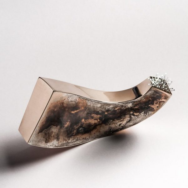 Altro elemento che associo al vino e al gioiello è la luce, così ho inserito all’interno una fonte luminosa anch’essa, per me, sinonimo di libertà. La luce che ho usato è però incanalata e guidata all’interno del gioiello, per uscirne fuori attraverso tanti piccoli fili di lenza, altrimenti, la luce sarebbe accecante. Da qui la necessità del vincolo, rappresentato dalla struttura in bronzo. Il bronzo con il suo colore caldo e rosato mi è sembrato il materiale ideale per fare un gioiello legato al vino.