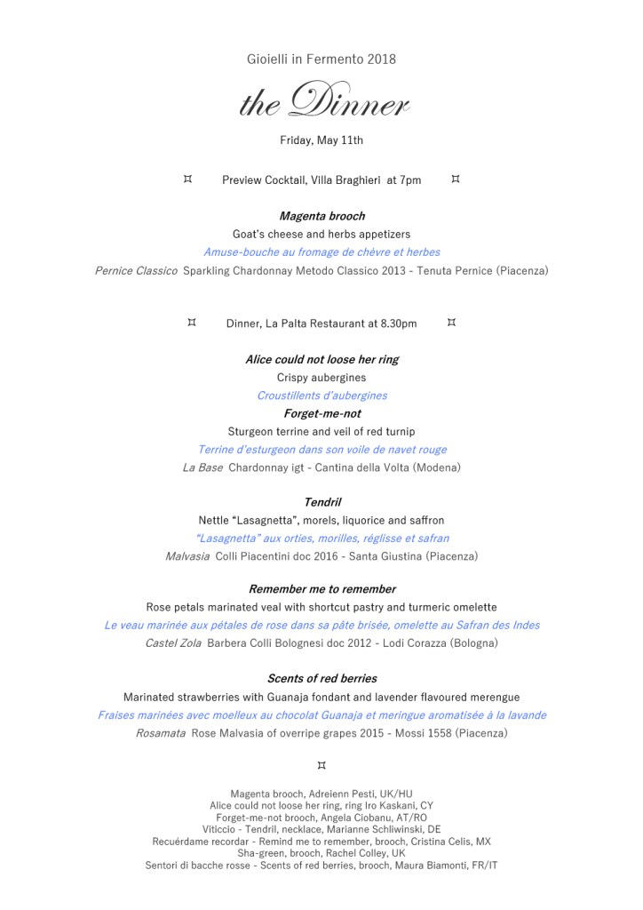 In apertura al programma espositivo legato al progetto Gioielli in Fermento si è svolta la serata di anteprima con una cena studiata per l’occasione dalla cuoca stellata Isa Mazzocchi: opere-gioiello in mostra e nel piatto.